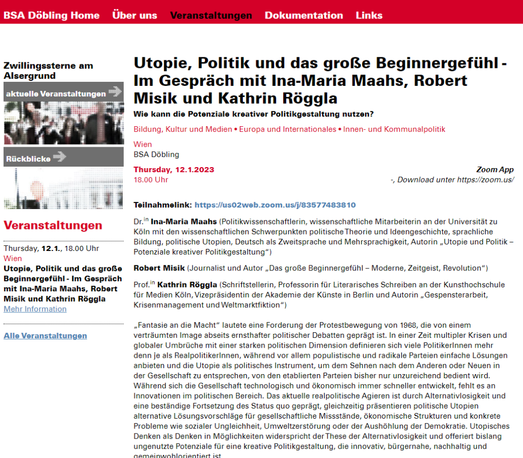 Nähere Informationen zu diesem Veranstaltungsangebot findet Ihr hier: Utopie, Politik und das große Beginnergefühl – Im Gespräch mit Ina-Maria Maahs, Robert Misik und Kathrin Röggla | doebling.bsa.at