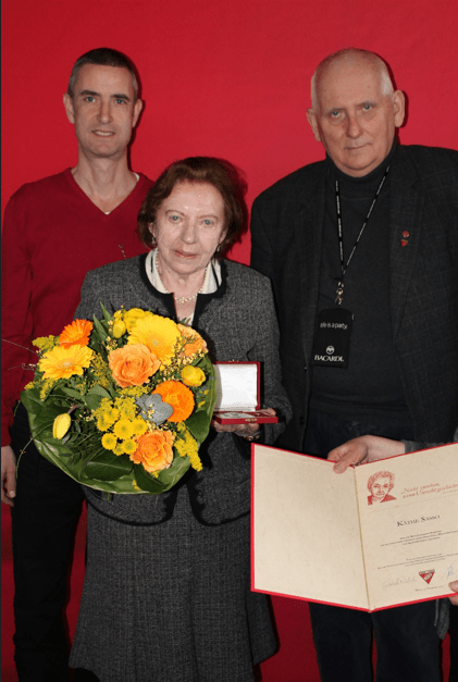 Text: Katharina „Käthe“ Sasso erhielt 2015 die Rosa-Jochmann-Plakette, im Bild mit Gerald Netzl (l.) und dem damaligen Bundesvorsitzenden Johannes Schwantner (r., † 2018)