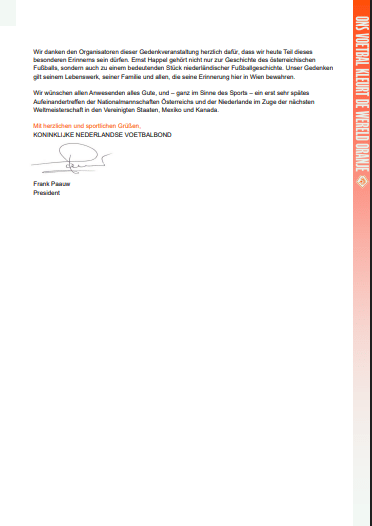 Wir danken den Organisatoren dieser Gedenkveranstaltung herzlich dafür, dass wir heute Teil dieses besonderen Erinnerns sein dürfen. Ernst Happel gehört nicht nur zur Geschichte des österreichischen Fußballs, sondern auch zu einem bedeutenden Stück niederländischer Fußballgeschichte. Unser Gedenken gilt seinem Lebenswerk, seiner Familie und allen, die seine Erinnerung hier in Wien bewahren.