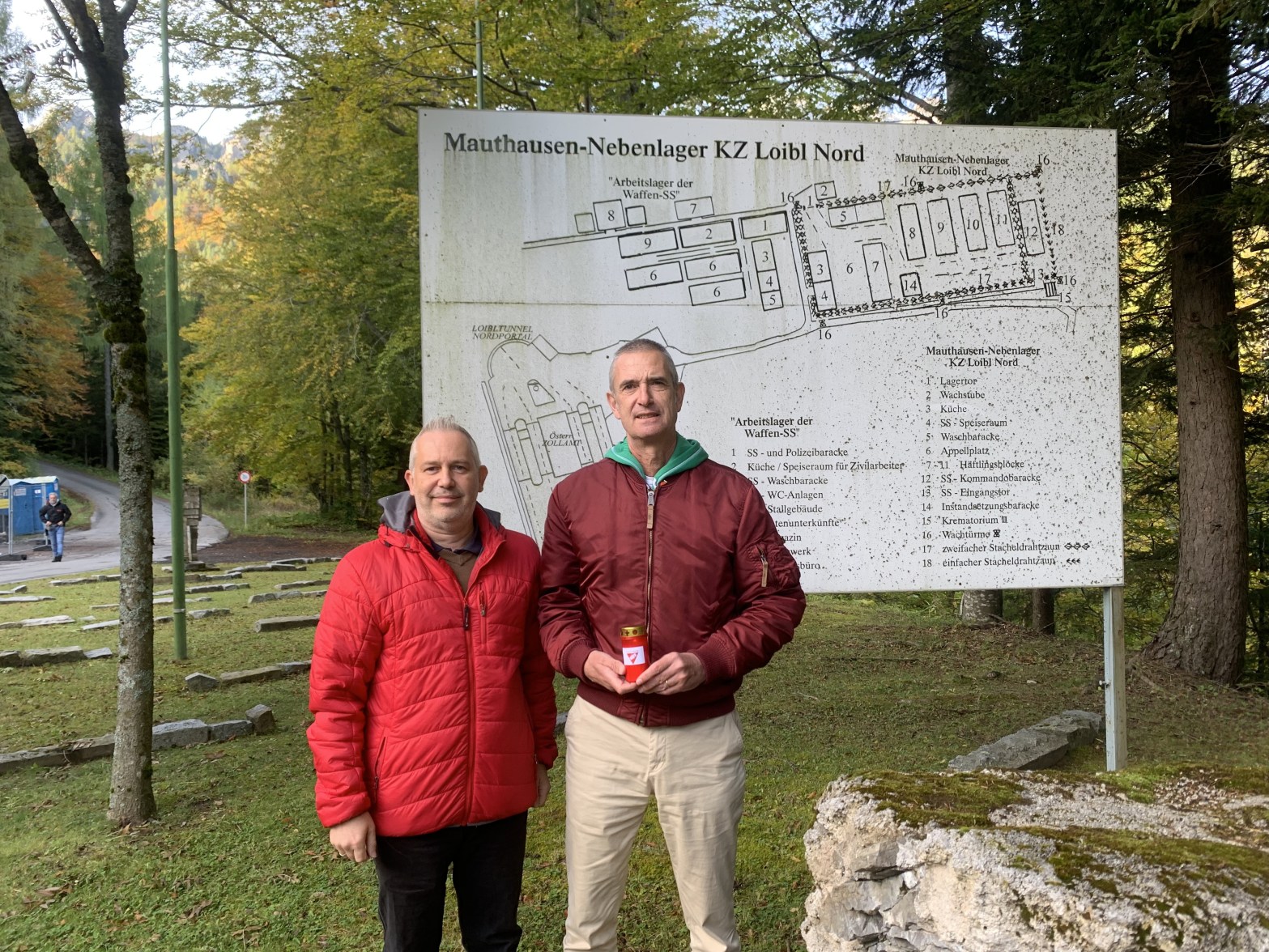 Fotobeschreibung: Martin Gressl, Vorsitzender unseres Kärntner Landesverbandes, und Gerald Netzl bei der Gedenkstätte des Außenlagers Loibl Nord. Dort entsteht in den kommenden Monaten ein neuer Museumspavillon.