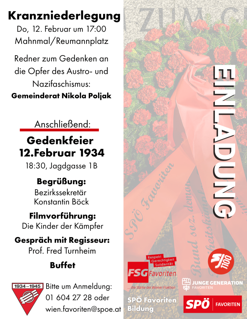 Die FreiheitskämpferInnen Ottakring laden am 10.02.2026 um 18:30 Uhr zu einer Gedenkveranstaltung an die Opfer des 12 Februar 1934, bei der Gedenktafel des ehem.