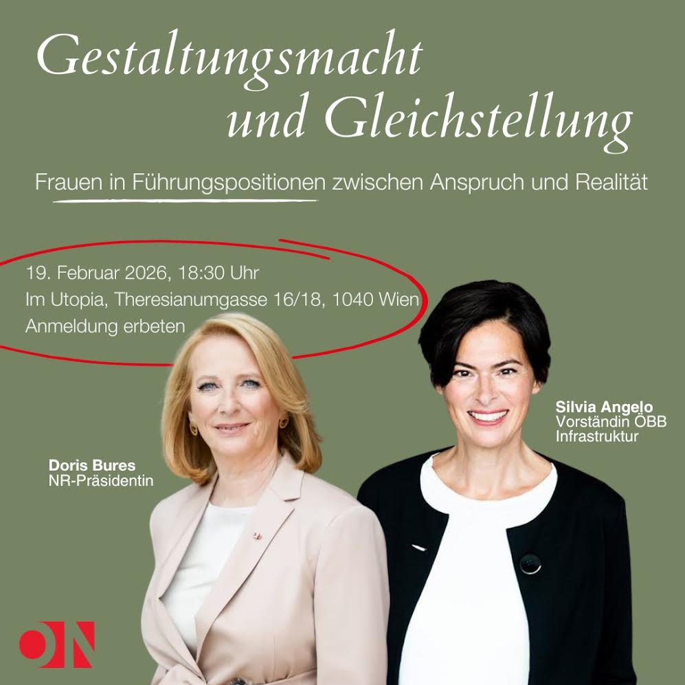 | SON-Veranstaltung: Gestaltungsmacht und Gleichstellung Wir laden dich sehr herzlich zu unserer Veranstaltung „Gestaltungsmacht und Gleichstellung“ ein. Gemeinsam mit Doris Bures, NR-Präsidentin, und Silvia Angelo, Vorständin der ÖBB-Infrastruktur, sprechen wir über Frauen in Führungspositionen – zwischen Anspruch und Realität. Dabei geht es um konkrete Erfahrungen, politische Verantwortung und die Frage, wie Gleichstellung aktiv gestaltet werden kann. 📅 Donnerstag, 19. Februar 2026 ⏰ 18:30 Uhr 📍 Utopia, Theresianumgasse 16/18, 1040 Wien 👉 Anmeldung erbeten – wir freuen uns auf Deine Teilnahme und eine spannende Diskussion. 👉 https://innerestadt.spoe.wien/son-veranstaltung |