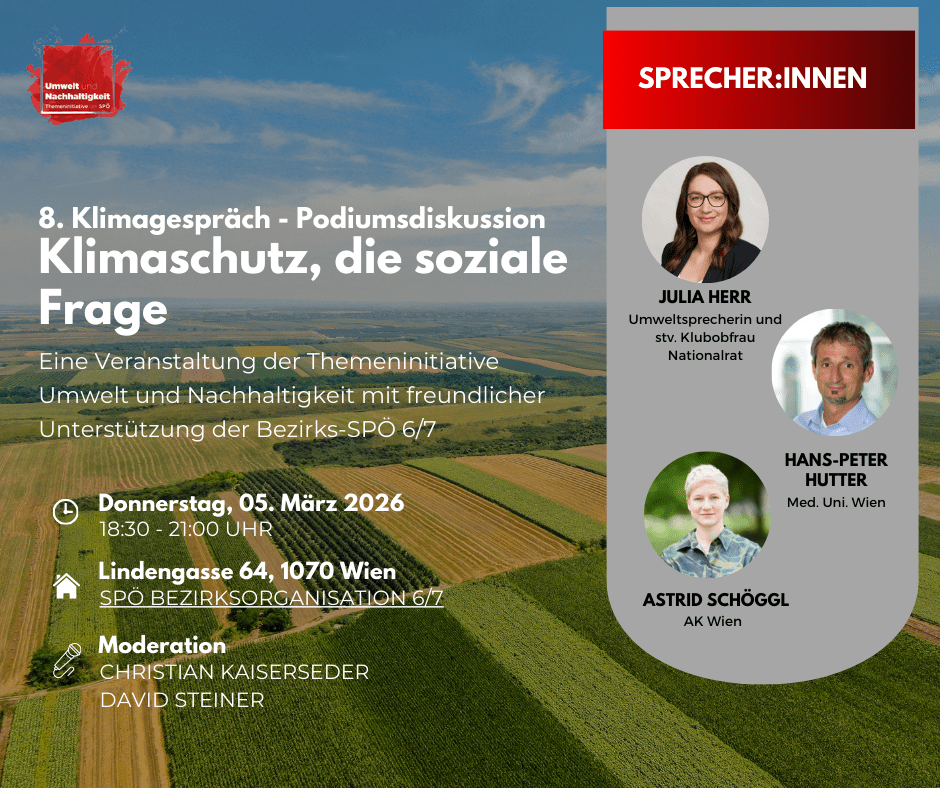 Die Themeninitiative Umwelt und Nachhaltigkeit der SPÖ lädt am 05. März 2026 ab 18:30 Uhr in die SPÖ Bezirksorganisation 6/7 zu einer spannenden Podiumsdiskussion ein.