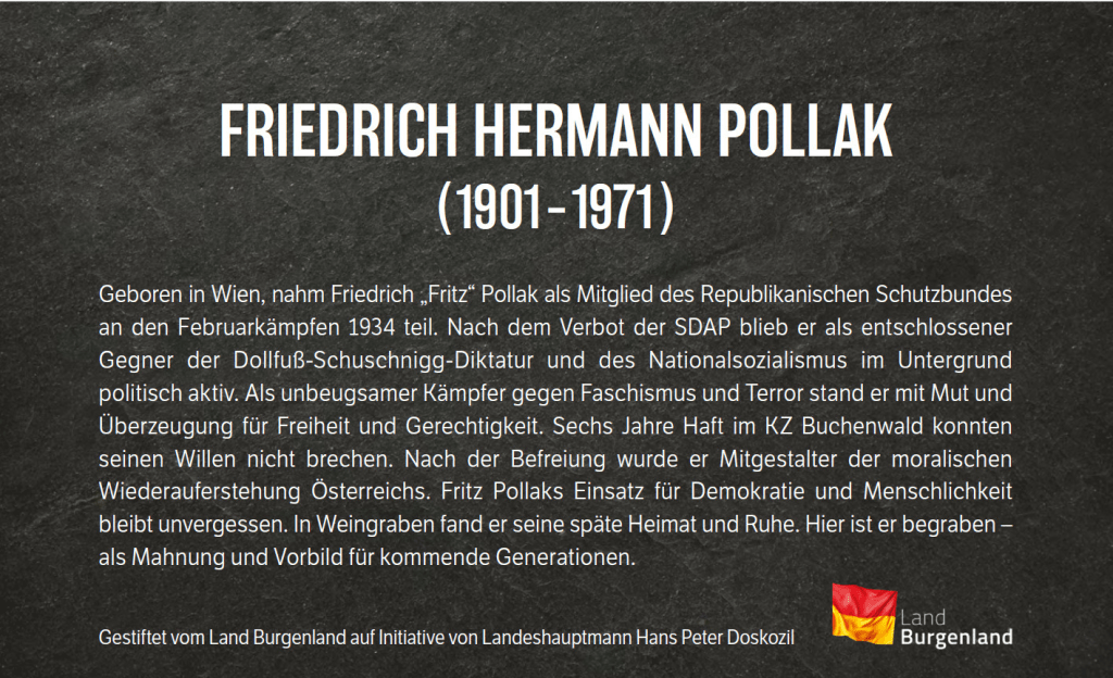 Im burgenländischen Weingraben wurde im Rahmen einer Gedenkveranstaltung an den sozialdemokratischen Widerstandskämpfer Friedrich Pollak erinnert. Vertreter*innen aus Politik, Wissenschaft, Bildung und Zivilgesellschaft würdigten dabei sein Leben und sein Engagement für Demokratie, Freiheit und soziale Gerechtigkeit. Die Veranstaltung machte deutlich, wie wichtig aktive Erinnerungskultur gerade in Zeiten zunehmender demokratischer Herausforderungen ist. „Sozialdemokratinnen und Sozialdemokraten standen in der Geschichte niemals auf der Seite der Henker. Sie standen immer auf der Seite der Menschen – im Widerstand gegen Unterdrückung, im Kampf für Freiheit, Solidarität und Demokratie“, betonte SPÖ-Bundesparteivorstandsmitglied Dr. Roland Fürst. Der Blick in die Geschichte der Arbeiter*innenbewegung zeige, dass viele Sozialdemokratinnen und Sozialdemokraten mutig gegen autoritäre Regime aufgetreten seien. Diese Tradition des Antifaschismus und der Solidarität sei bis heute Auftrag für eine Politik, die konsequent an der Seite der Menschen stehe. ****