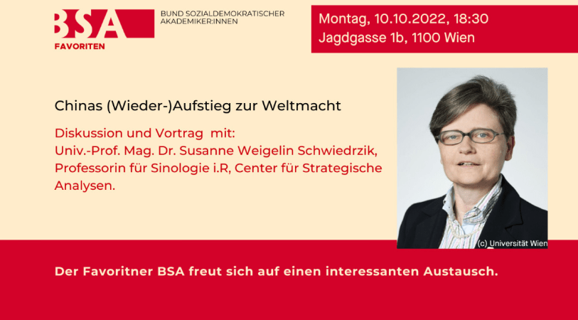Der BSA Favoriten lädt herzlich zu einem spannenden Abend mit einer hochkarätigen China-Expertin ein! Montag, 10. Oktober, 18:30 UhrJagdgasse 1b Chinas (Wieder-)Aufstieg zur Weltmacht Diskussion und Vortrag mit:Univ.-Prof. Mag. Dr. Susanne Weigelin Schwiedrzik,Professorin für Sinologie i.R, Center für Strategische Analysen China hat sich seit dem Beginn der 1980er Jahre auf einen eigenständigen Entwicklungs- und Reformpfad„10. Oktober 2022, 18:30 Uhr: Chinas (Wieder-)Aufstieg zur Weltmacht“ weiterlesen