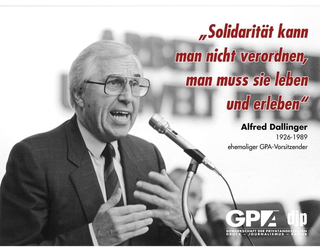 7.11.1926, Wien – 23.2.1989, Bodensee (Flugzeugabsturz) Schon Stillstand (in der Sozialpolitik) ist ein Rückschritt. Alfred Dallinger war gelernter Drogist. 1948 wurde er Jugendsekretär der Gewerkschaft der Privatangestellten, 1966 deren Geschäftsführer-Stellvertreter und Zentralsekretär, und 1974 Vorsitzender und Geschäftsführer der GPA. Von 1974 bis 1983 war Dallinger auch Abgeordneter zum Nationalrat, von 1980 bis zu seinem Tod Sozialminister.„7. November 2025: Gedenken an Alfred Dallinger“ weiterlesen