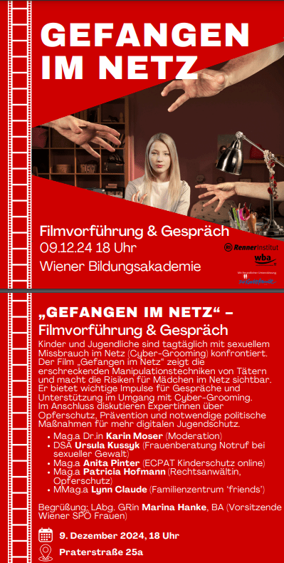 Filmvorführung / Gespräch 9. Dezember 2024, 18 Uhr Vorführung des Dokumentarfilms „Gefangen im Netz“ (CZ 2020, R: Vít Klusák, Barbora Chalupová) Kinder und Jugendliche sind tagtäglich mit sexuellem Missbrauch im Netz (Cyber-Grooming) konfrontiert. Der Film „Gefangen im Netz“ schafft Bewusstsein für die Gefahren, die im Speziellen Mädchen im Internet drohen. Sehr klar werden hier Techniken der„1. Dezember 2024: „Gefangen im Netz“ – Schutz von Frauen/Mädchen vor sexueller Gewalt und Übergriffen im Internet – Filmvorführung / Gespräch am 9. Dezember“ weiterlesen