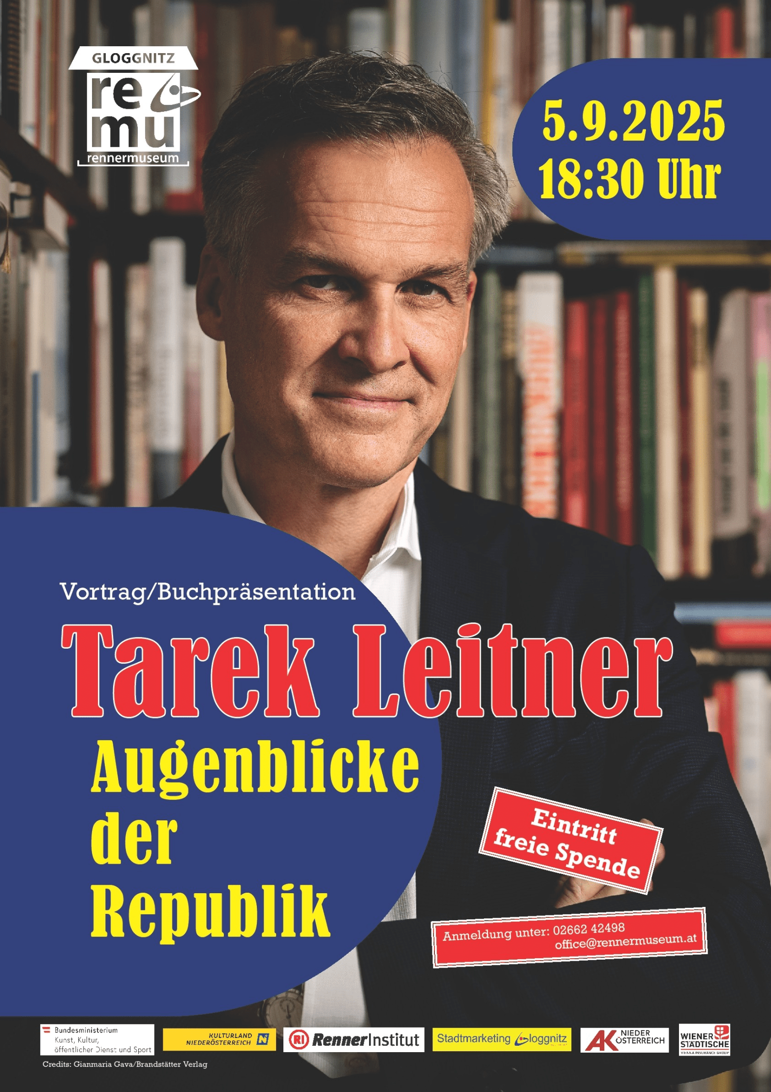 Liebe Kulturfreund:innen, zum Start in den Spätsommer stellen wir ein besonderes Programm-Highlight vor: Buchpräsentation und Vortrag von Tarek Leitner: „Augenblicke der Republik“ 5. September 2025, 18:30, Rennergasse 2, 2640 Gloggnitz (Karl-Renner-Museum) Tarek Leitner ist einer der bekanntesten Fernsehjournalisten Österreichs. Er ist jedoch auch ein erfolgreicher Buchautor. Im Rahmen eines Vortrages und Publikumsgesprächs wird er über„28. August 2025: Newsletter Karl-Renner-Museum: Terminvorschau: Buchpräsentation und Vortrag von Tarek Leitner – in Gloggnitz, am 5. September 2025“ weiterlesen