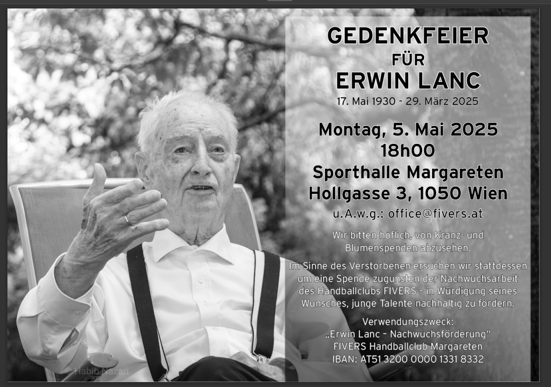 Liebe Freund:innen, Wegbegleiter:innen und Unterstützer:innen, wir laden herzlich zur Gedenkfeier für unseren verstorbenen Ehrenvorsitzenden, Bundesminister a.D. Erwin Lanc ein, die am Montag, 5. Mai 2025, 18:00 Uhr, in der Sporthalle Margareten – Hollgasse 3, 1050 Wien, stattfinden wird. Wir erinnern an einen wunderbaren und außergewöhnlichen Menschen – Sozialdemokrat, Bundesminister, Sportfunktionär und treuer Wegbegleiter des Handballclubs FIVERS Margareten. Mit Redebeiträgen„26. April 2025: Vorschau: Gedenkfeier für Bundesminister a.D. Erwin Lanc am 05. Mai in der Sporthalle Margareten“ weiterlesen