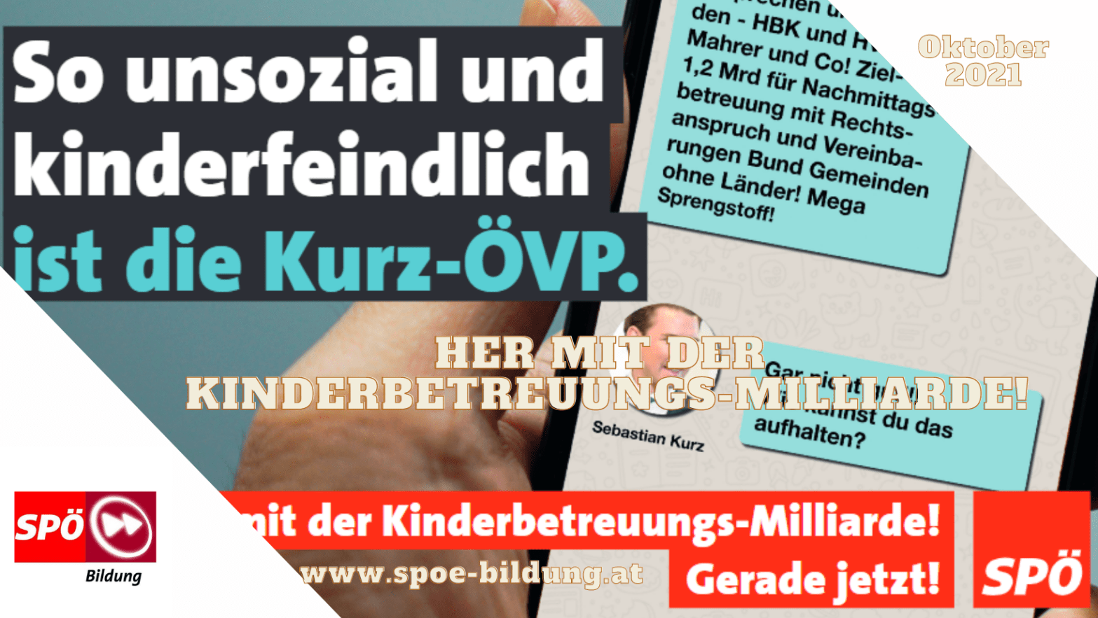 Eine gut ausgebaute Kinderbetreuung ist wichtig für alle Familien, Frauen und Kinder in unserem Land. Umso grauslicher sind die kürzlich bekannt gewordenen Kurz-Chats: Aus reiner Machtgier hat Kurz die Regierung Kern/Mitterlehner sabotiert und persönlich den Ausbau der Kinderbetreuung in Österreich verhindert! Warum? Weil der damalige Außenminister Kurz, Kern und Mitterlehner keinen Erfolg gönnen wollte. Die„14. Oktober 2021: Her mit der Kinderbetreuungs-Milliarde!“ weiterlesen