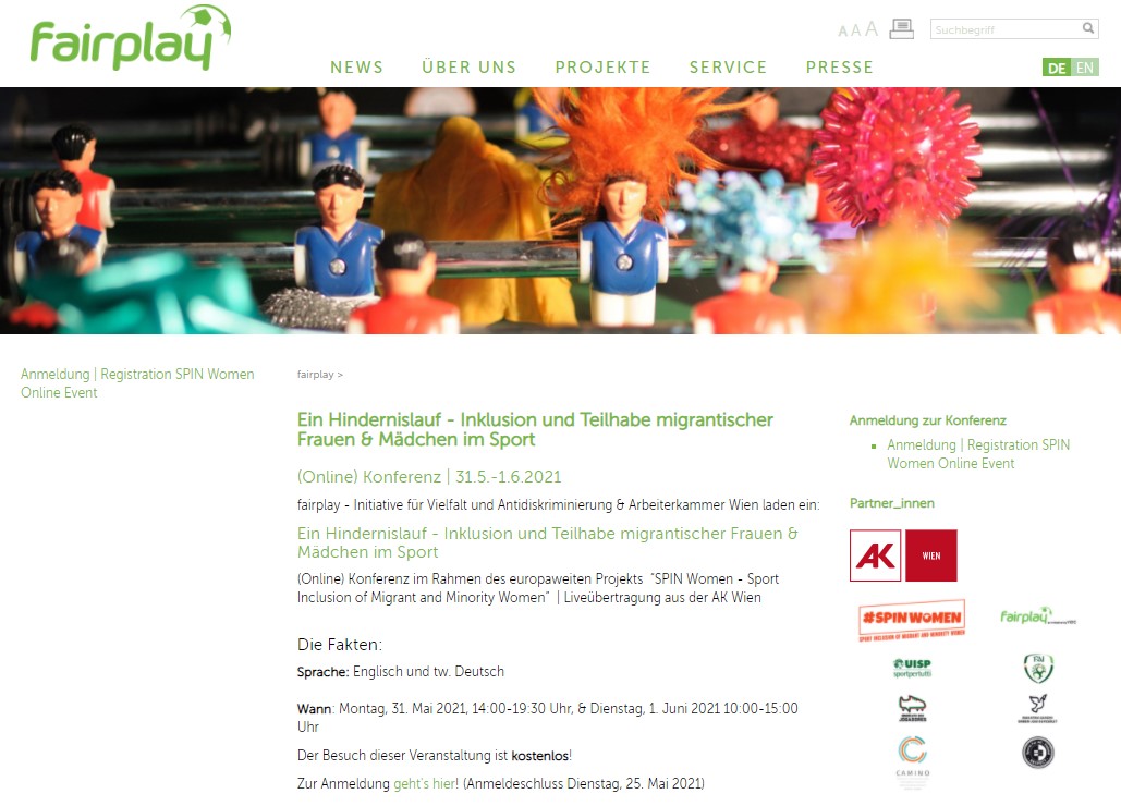 fairplay – Initiative für Vielfalt und Antidiskriminierung und Arbeiterkammer Wien laden ein zur (Online) Konferenz im Rahmen des europaweiten Projekts “SPIN Women – Sport Inclusion of Migrant and Minority Women” Montag, 31. Mai 2021, 14:00-19:30 Uhr sowie Dienstag, 1. Juni 2021, 10:00-15:00 Uhr Liveübertragung aus der AK Wien (Englisch und tw. Deutsch) Ein männlich dominiertes Feld wie der Sport lässt Frauen und Mädchen wenig Raum: medial, aber auch was Teilhabe, Infrastruktur und finanzielle Unterstützung betrifft. Umso mehr trifft das auf jene zu, die nicht„Montag, 31. Mai sowie Dienstag, 1. Juni 2021: Ein Hindernislauf-Inklusion und Teilhabe migrantischer Frauen und Mädchen im Sport“ weiterlesen