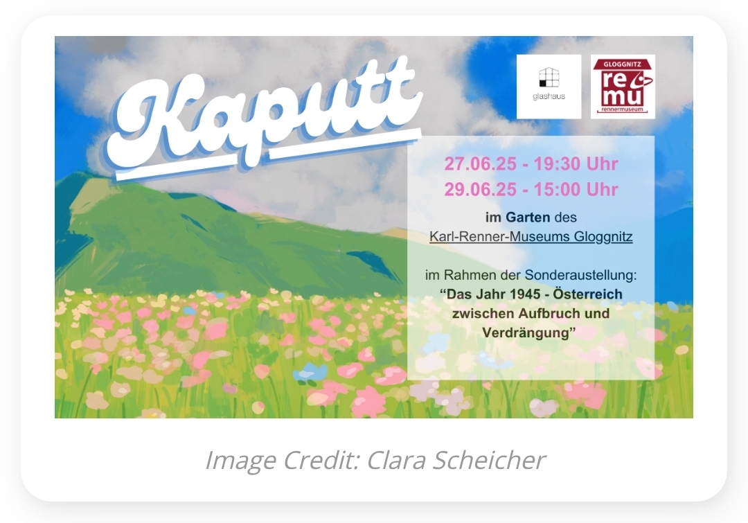 Liebe Kulturfreund:innen, Das Jubiläum 80 Jahre Zweite Republik ist das diesjährige Schwerpunktthema des Karl-Renner-Museums. Aus diesem Anlass haben Thomas Kodnar (Text) und Elena Schwarz (Regie) vom Theater-Kollektiv Glashaus ein typisch österreichisches Stück namens Kaputt dramaturgisch und theatralisch inszeniert. In einem kleinen Dorf, verwüstet von einer verirrten Bombe, verbreitet sich die Nachricht vom Kriegsende. Die schwere„27. Juni 2025: Einladung: Szenische Lesung „Kaputt““ weiterlesen