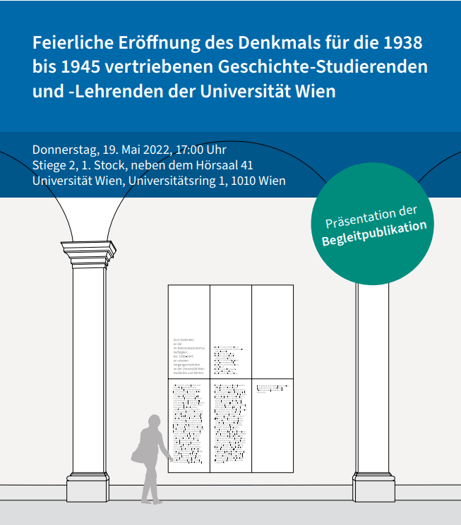 Donnerstag, 19. Mai 2022, 17:00 UhrStiege 2, 1. Stock, neben dem Hörsaal 41Universität Wien, Universitätsring 1, 1010 WienFeierliche Eröffnung des Denkmals für die 1938 bis 1945 vertriebenen Geschichte-Studierenden und -Lehrenden der Universität Wien Präsentation derBegleitpublikationAn der Universität Wien wurden mit der Machtübernahme durch denNationalsozialismus 1938 rund 3.000 vorwiegend jüdische Angehörigeder Universität entlassen und in der„19. Mai 2022: Denkmal für die 1938 bis 1945 vertriebenen Geschichte-Studierenden und -Lehrenden der Universität Wien“ weiterlesen