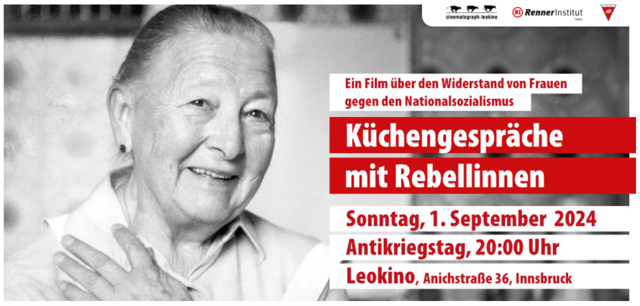 Datum: 01.09.2024Uhrzeit: 20:00Ort: Leokino, Anichstraße 36, InnsbruckAnmeldung: https://www.ri-tirol.at/aktuelles/film-kuechengespraeche-mit-rebellinnen Ein Film über den Widerstand von Frauen gegen den Nationalsozialismus. Anfang der 1980er Jahre machte sich die „Projektgruppe Frauen im antifaschistischen Widerstand“ auf die Suche nach „Rebellinnen“, die sich gegen das NS-Regime gestellt haben. Was als eines der ersten Oral- und Video-History Projekte Österreichs begann, mündete in dem Buch „Der„1. September 2024: Film: Küchengespräche mit Rebellinnen“ weiterlesen