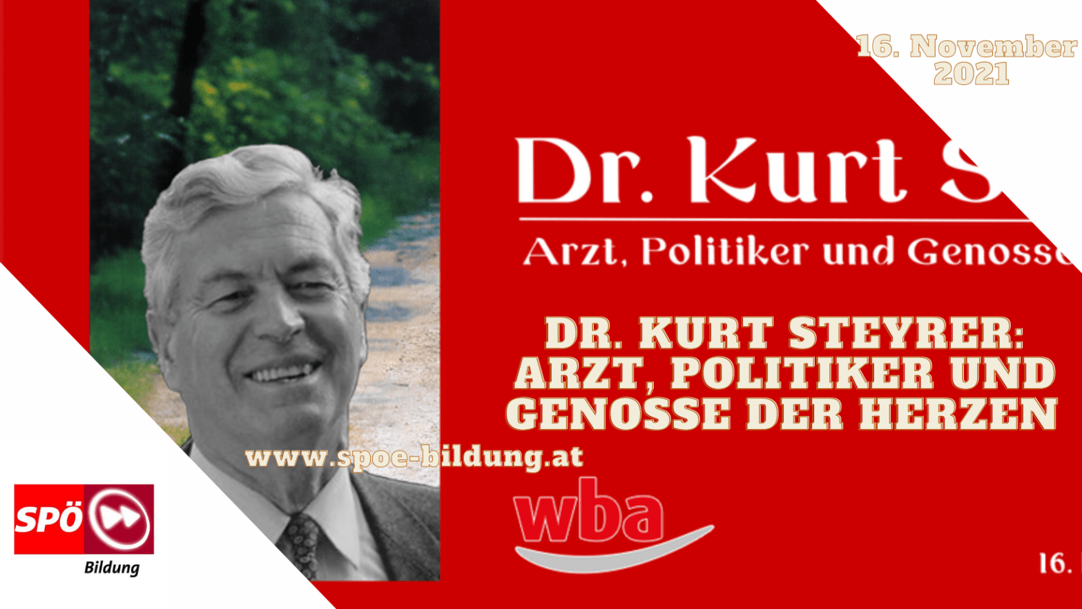 Kurt Steyrer wäre am 3. Juni 2020 100 Jahre geworden, aus diesem Anlass wollen wir uns dem Lebenswerk des 2007 verstorbenen Sozialdemokraten widmen. Kurt Steyrer studierte Medizin in Wien und an der Universität Prag (Promotion 1945). 1951 eröffnete er eine Facharztpraxis als Dermatologe und war von 1952 bis 1981 Betriebsarzt bei der Simmering-Graz-Pauker AG. 1946„16. November 2021, 17:00 Uhr: Dr. Kurt Steyrer: Arzt, Politiker und Genosse der Herzen“ weiterlesen